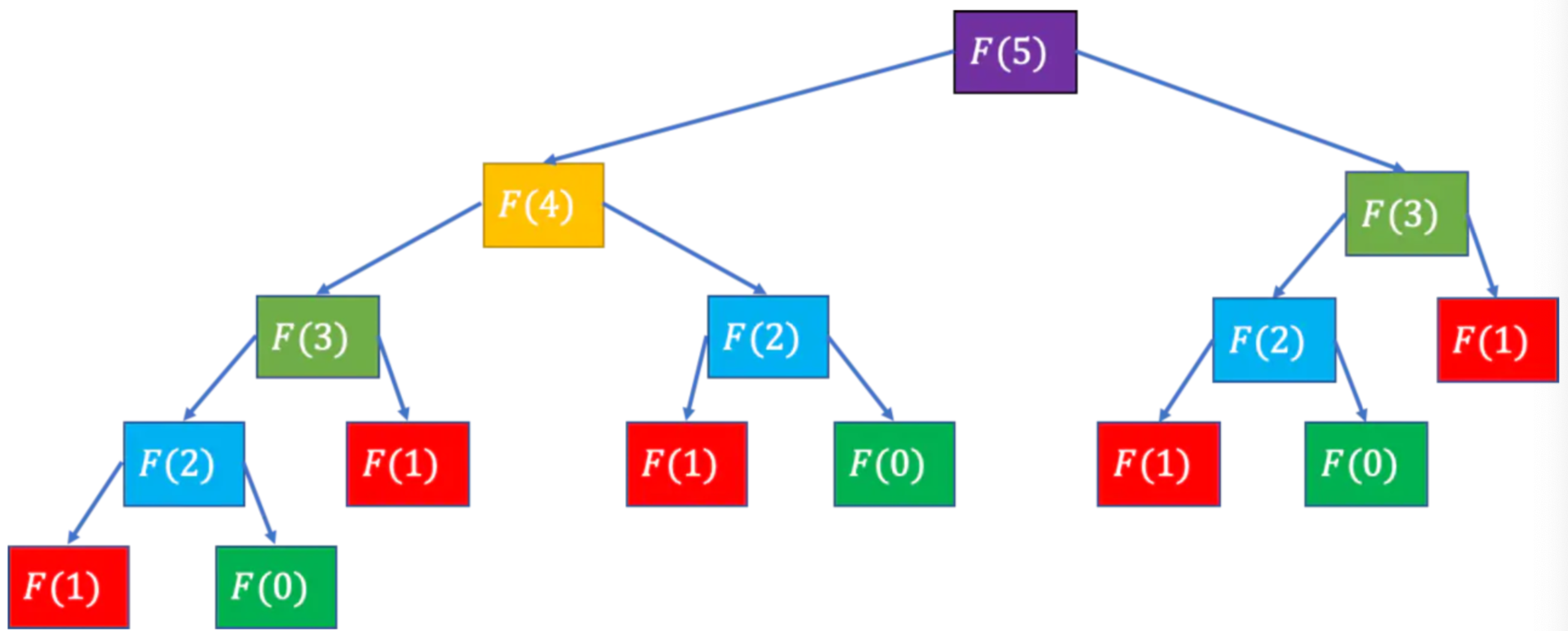 在 n 层的完全二叉树中,节点的总数为 2n − 1 ,所以得到 F(n) 中递归数目的上限为 2n − 1 。因此我们可以大概估出 F(n) 的时间复杂度为 O(2^n)。在斐波那契中有大量重复的计算,我们可以把已经计算过的存起来,同样的计算再取出来。