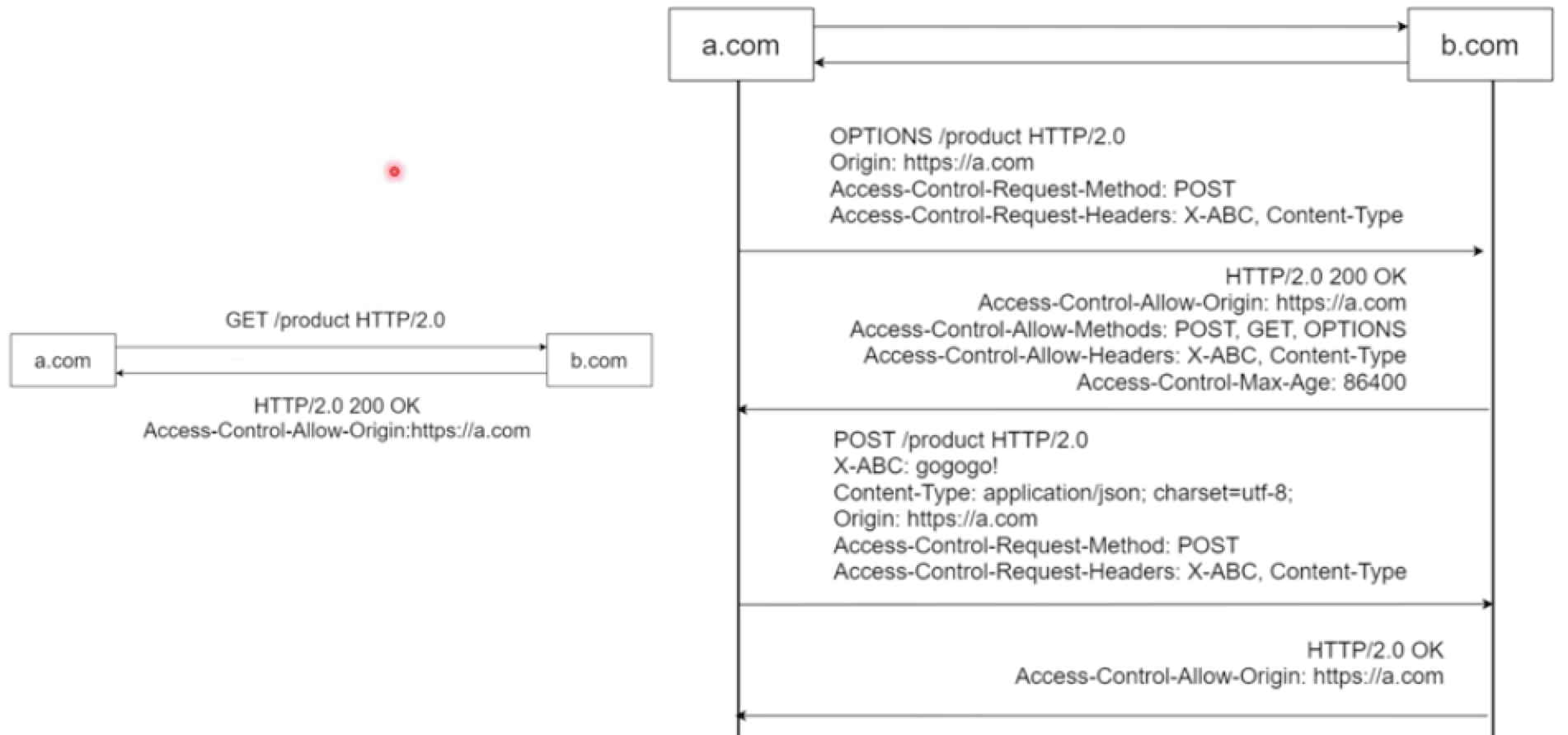 但是还有复杂一点的请求,我们需要先发OPTIONS请求,a.com想请求b.com它需要发一个自定义的Headers:X-ABC和content-type,这个时候就不是简单请求了, a.com要给b.com 发一个options请求,它其实在问b.com我用post行不行,还想在Headers中带X-ABC和content-type;并不是所有的headers都发这个OPTIONS请求,因为X-ABC是自定义的,所以需要发;b.com看到OPTIONS请求,先不会返回数据,先检查自己的策略,看看能不能支持这次请求,如果支持就返回200。