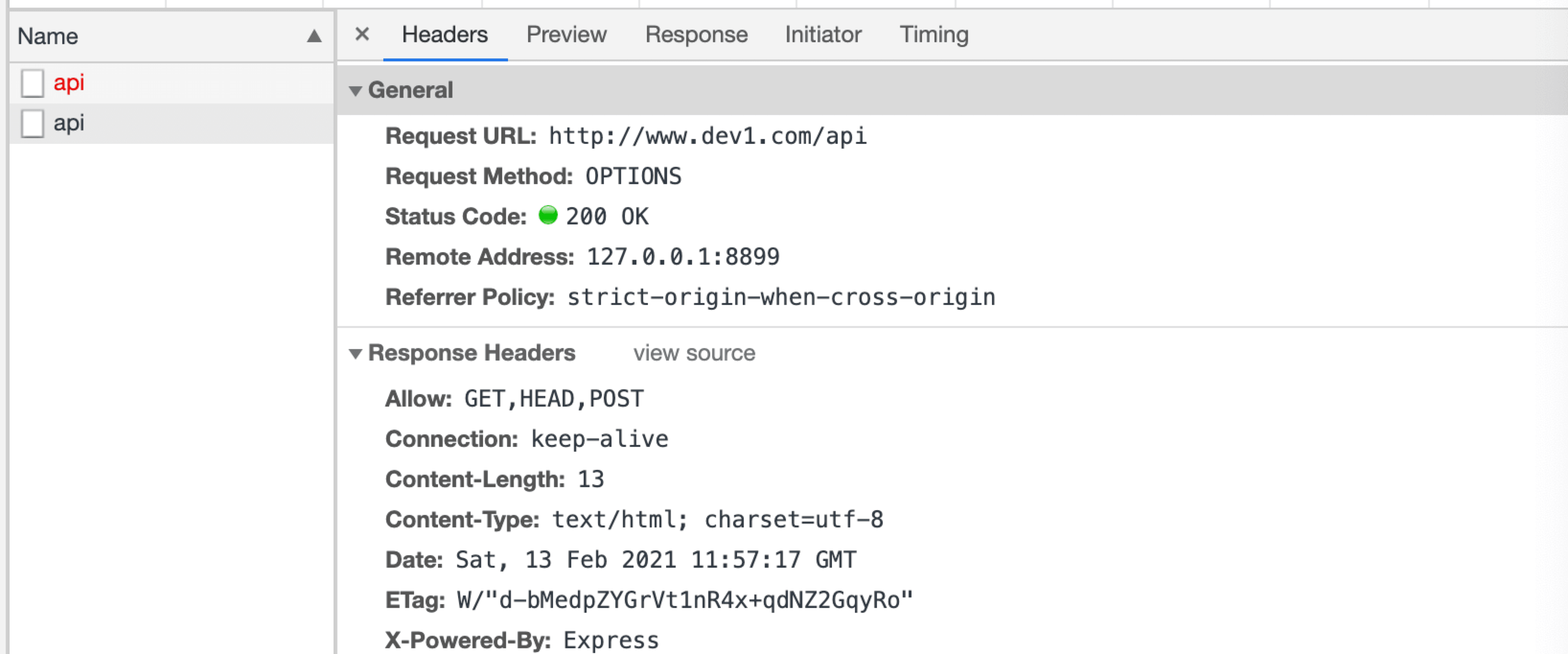 在浏览器控制面板输入fetch('http://www.dev1.com/api',{method:'POST',headers:{'Content-Type':'application/json'}})进行请求; 再次请求并加content-type字段,如果我们用post请求并在headers里加字段content-type:'application/json',因为这是复杂请求,浏览器会先发送一个options请求,我们需要设置响应的headers允许添加某个字段。