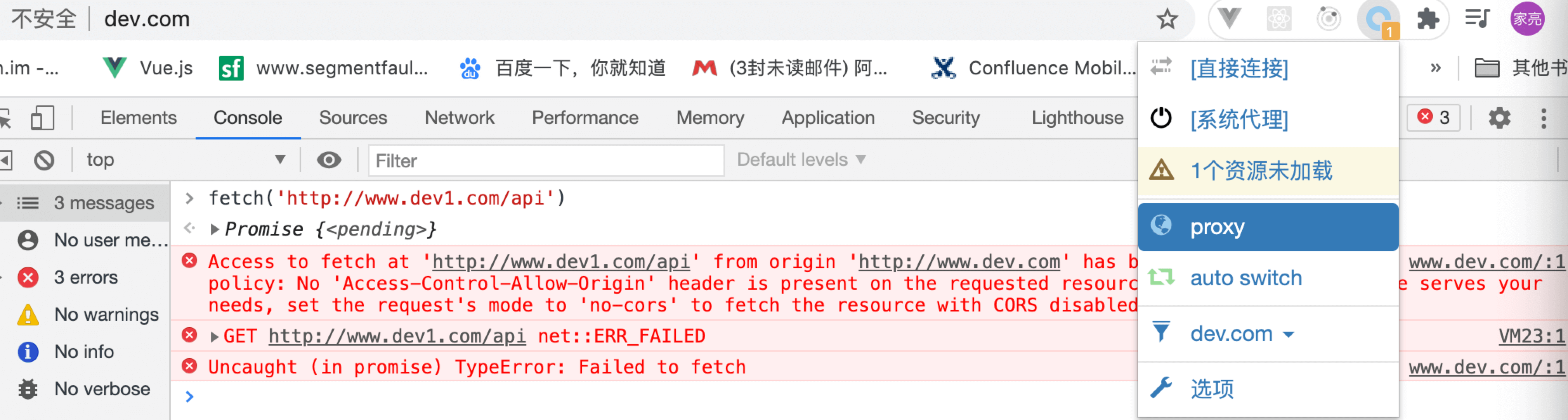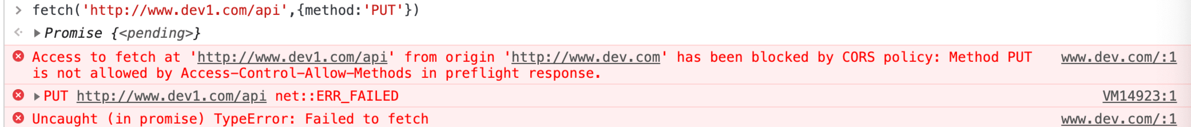 fetch('http://www.dev1.com/api',{method:'POST',mode:'no-cors'}) 这种加上no-cors,会显示请求成功了,但是拿不到数据,这种请求属于透明请求。