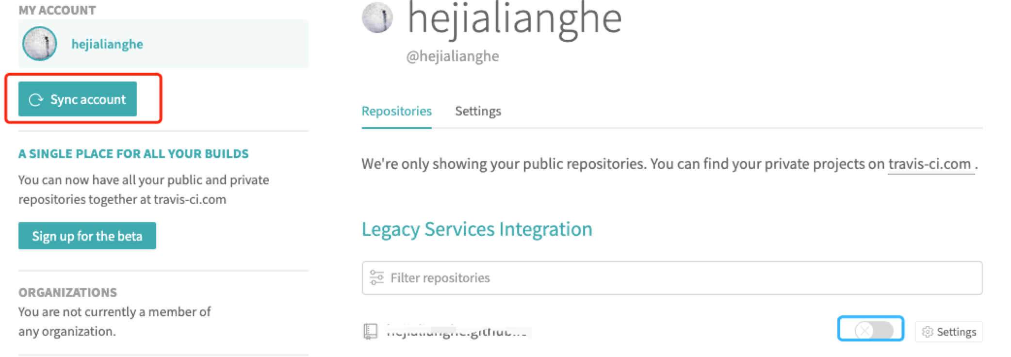 首先我们准备一个github账号,然后访问Travis Ci;用github账号去登录;然后点红色标识的按钮更新仓库,点蓝色标识的部分触发某个项目进行构建。